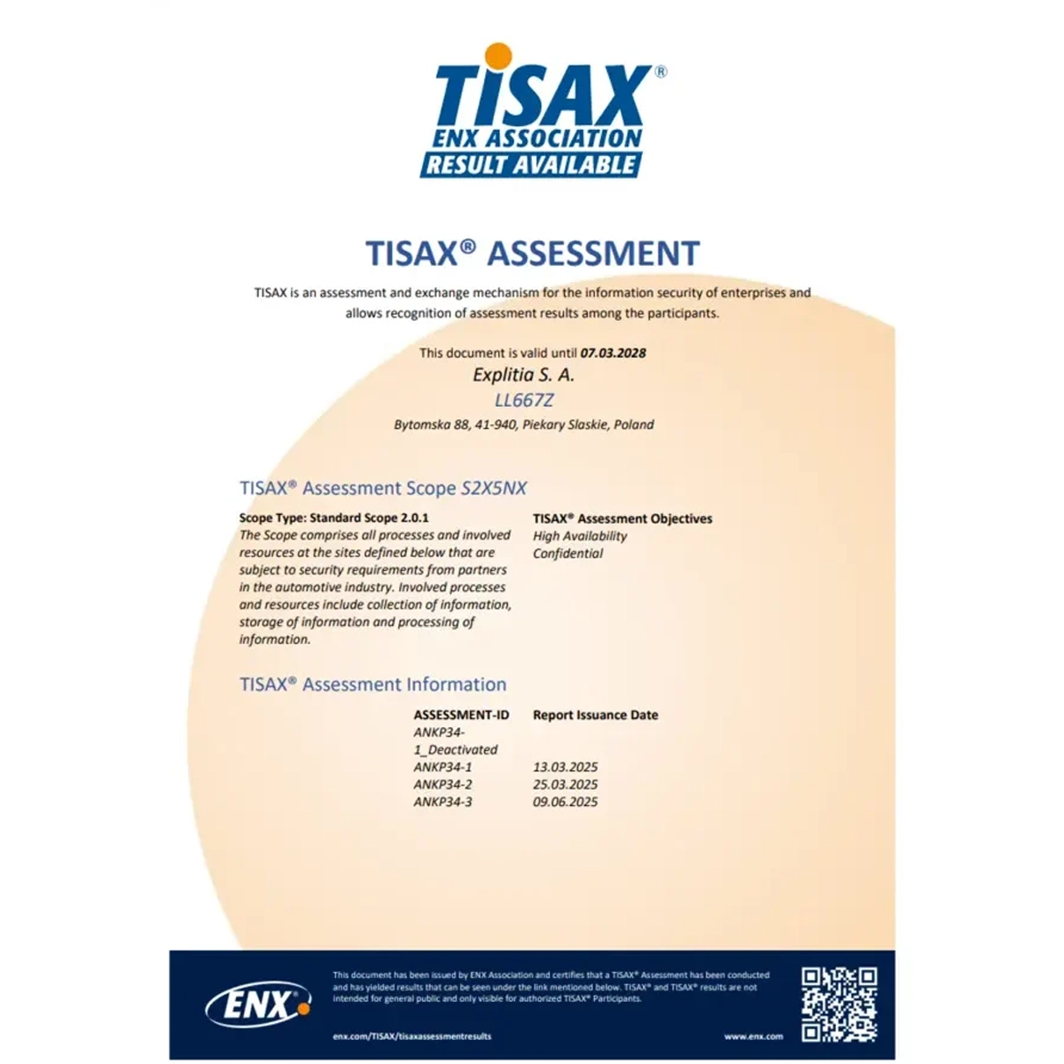 We hold a TISAX Assessment Level 2 (AL2) certificate, confirming compliance with international information security standards based on ISO/IEC 27001.